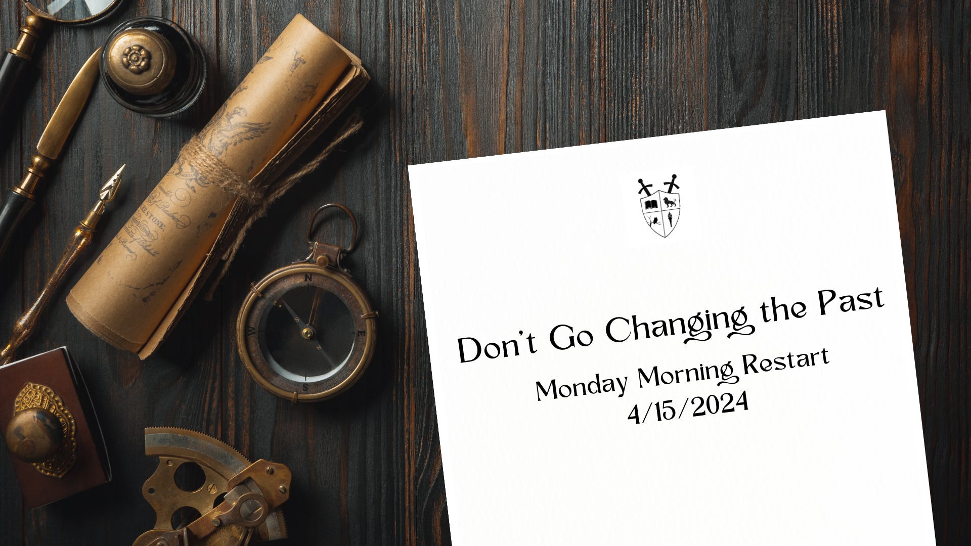 So, for this week: Don’t go trying to change the past. It’s over and done with. Learn from it. Admit your mistakes. Think about what you’ll do differently next time. I tell the boys at my work all the time: Regret, don’t dwell. It’s okay to regret a past mistake, whether it’s something you did do or didn’t do. That’s all fine. But it doesn’t help anyone to dwell on it. All you do is ruin your day. Or, for me, your weekend.